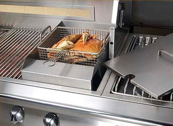 A deep fryer and steamer combo will be useful in an outdoor kitchen if you plan to fry chicken strips and French fries, or steam crab. You will also be able to boil pasta and lobster. There are two types of outdoor fryers, the first is built-in like the Cal Flame Deep Fryer, the second drops into your grill in place of a grilling grate like the Alfresco Steamer/Fryer. If you plan to use the fryer often, then built-in is the way to go because of the convenience.