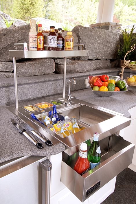 If you plan to use your outdoor kitchen frequently for entertaining, you should consider a beverage center. A beverage center will be like having a bar outside and will ensure that you always have cold drinks on hand for guests. Plus, it will look a lot classier than an ice chest with the lid propped open. Beverage centers range from a simple drop-in cooler with condiment trays to elaborate outdoor bars that can support a professional bartender. Consider opting for a beverage center with a sink, this way you won't have to purchase and have one installed separately. Often a beverage center makes more sense than an outdoor refrigerator because you can fill it with ice when needed and won't have to pay for electricity.
