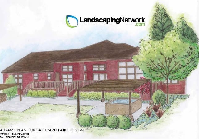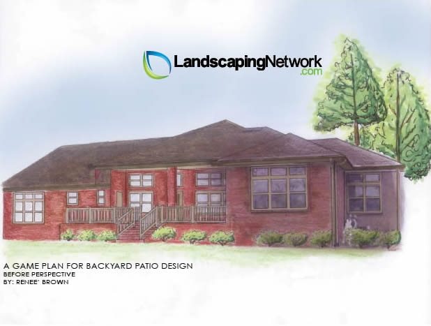 An explanation of the design decisions made for a residential backyard patioThe floor plan of this large family home with its doorway access to the patio drives the entire circulation plan, but once free of the building the outdoor living spaces take on a life of their own. The developer provided an elevated patio for this raised foundation brick home with its oversized view windows. A single staircase connects the elevated space to the ground level backyard.
