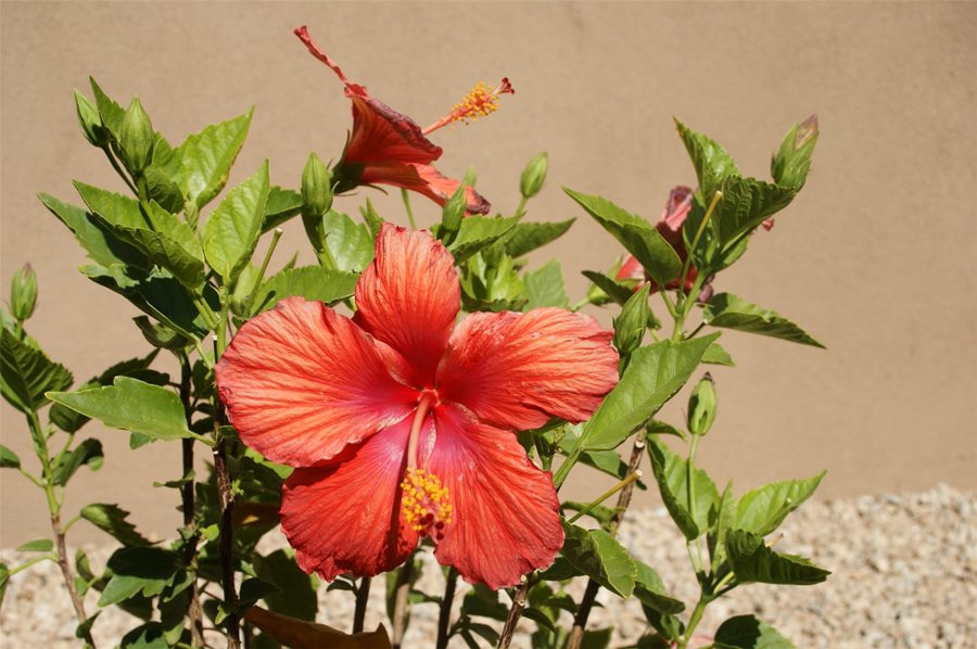 The swimming pool is the focal point of this landscape. It has a free-form design and features a raised spa with a spillway and a baja shelf. The organic shape of the pool helps to soften the rectangular footprint of the yard. A pair of water features spill out from a raised wall along the back side of the pool. However, the most eye catching aspect of this pool is the three fire features. "Four men hand set these features 6" below the bond beam of the pool shell as it was drying," explains Wilcoxson. Gas lines were installed at the proper height before setting the boulders in place. To avoid creating a distracting eyesore behind the pool, the equipment was hidden behind a wall stuccoed and painted to match the existing walls.