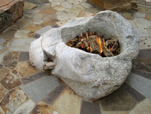 By hollowing out a wide hole in this boulder it can be used as a fire pit. In this case, wood is burned, but a boulder fire pit could also be connected to an underground gas line.