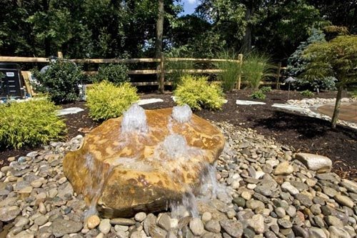 Here three holes were drilled in a boulder and it was plumbed to serve as a fountain. Water bubbles out of the rock and flows into a hidden underground reservoir. Learn more about disappearing fountains.