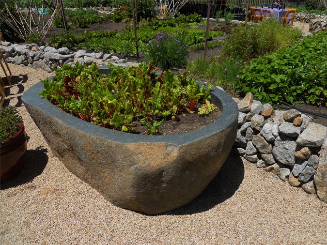 This raised planter was created from a boulder that was cut in half and hollowed out. Don't forget drainage holes on the bottom.