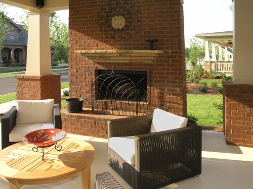 When a patio structure or the home architecture features brick in the facade or detailing, it should be extended to the outdoor fireplace so there is a cohesive appearance to the outdoor room.