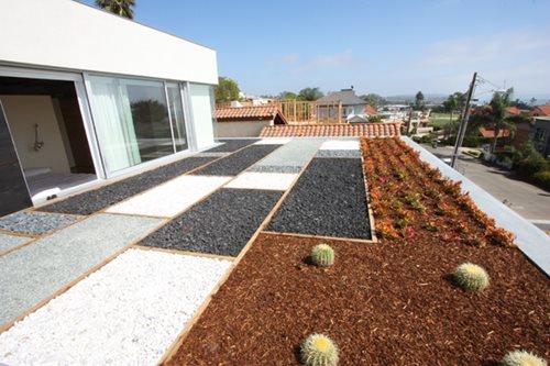 The living roof, also with ocean views, features rectangular fields of colored gravel, succulents and cacti.