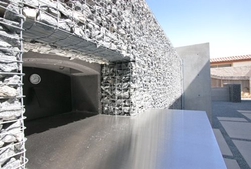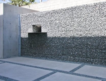 Because of its height, the gabion wall could not be constructed solely of caged rock. "The contractor built a block wall and using metal ties he attached a 6" thick gabion façade consisting of a double-layer of galvanized wire," explains Risner. The custom constructed gabion cages were then filled with a low grade construction rock, similar to the kind used for vehicle dust control on construction sites. There is a one foot return at the top of the wall that hides the block, making it appear as if the entire wall is made of gabions. The smooth finish of the hand-troweled concrete walls contrasts nicely with the rough texture of the rock inside the gabion façade.