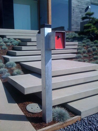 Cantilevered concrete steps that lead to the front door look like they are floating.