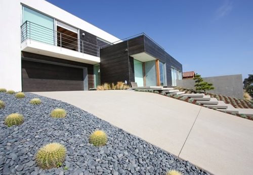 This landscape has a minimalistic and monochromatic design to match the architecture of the home.