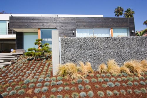 The 6 ½' retaining wall in the front yard is clad with a gabion façade.
