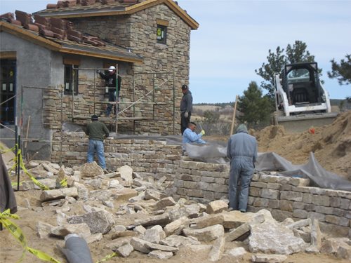 Answer: We constructed dry stacked retaining walls with Silioam stone, which is native to southern Colorado. We culled through the material to find the best pieces to fit, and hand sized and faced each piece of stone for a finished fit. Four men spent over a month setting the walls at the proper elevations. While this process was tedious and time consuming, we are happy with the even, flowing appearance of the walls that resulted.