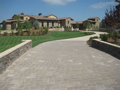 Answer: The 250' driveway is a combination of a special concrete finish with tumbled brick pavers used for bands. The same materials continue into the motor court. The low walls at the driveway opening and the apron detail are part of the community HOA design.