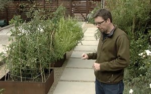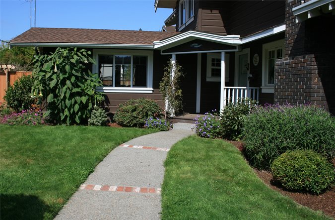 A curved concrete path gives an informal, organic entry to homes. The large sweeping curve allows visitors to be guided through your front yard landscaping and gives them a chance to get a good look at the front of your home. The curved walkway of this home is bordered with brilliant lavender and trees which extenuate the curve. Imagine how this landscape will look in 10 years with the trees forming a canopy to the entry, and the matured lavender spilling over the planting bed leading your eye right to the front door. This walkway breaks up the homes traditional, geometric style with its organic form, and provides an impressing contrast.
