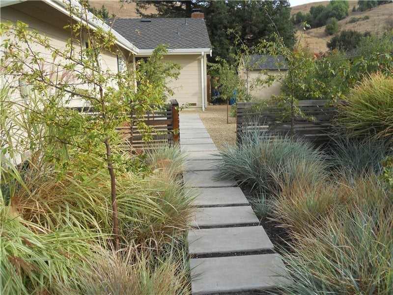 For a more contemporary walkway, concrete can be poured in oversized pavers. This creates the look of giant stepping stones. Typically shapes such as rectangles or circles are used to create a bold geometric pattern. The spaces between the poured concrete pavers can be seeded with grass or a low ground cover to bring life and color to the walkway.
