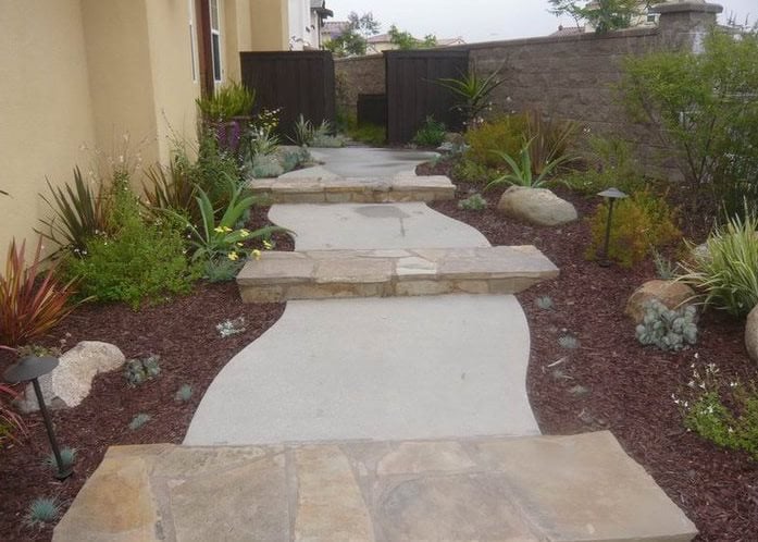 A straight design gives the visitor a formal entry that leads them right to your front door. As pictured here, this design consists of 4’ by 4’ squares of concrete laid in a straight direction, creating a pattern and leading you to the entry. Smooth river rock fills in between the concrete and throughout the landscape, creating a drought-tolerant modern design. The straight lines and geometric shapes are continued from the homes architecture into the landscape, with the straight walkway consisting of poured concrete squares and the rectangular planters with papyrus. The concrete walkway gives a formal and clean entry to this modern home.