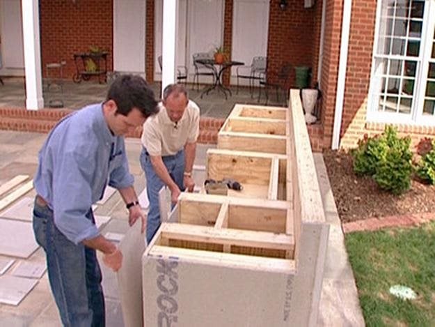 You can build your outdoor kitchen with wood. If choosing to build a wood-framed base you should use pressure-treated pine because it will hold up better under the extreme heat omitted by the grill and will be less likely to rot. In order to protect the wood frame from heat and water, it should be covered with cement backer board, both on the inside and outside of the structure. Be aware that there is still some concern over fire safety, even with the backer board in place.