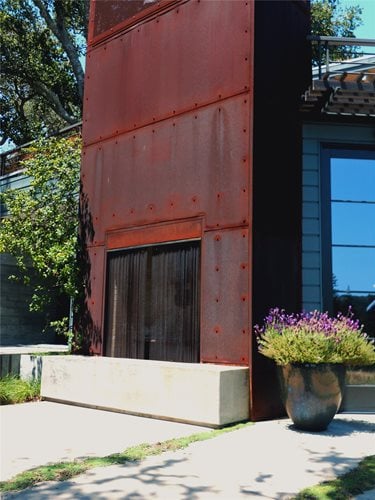This fireplace was finished with a veneer of corten steel allowed to rust and create its own patina for a uniquely modern architectural feature.