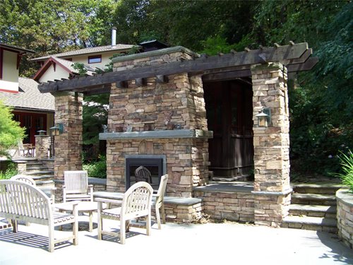 This unique combination of fireplace and two freestanding columns connected by a wood arbor overhead. Such structures support unique lighting opportunities from fixtures integrated into the overhead.