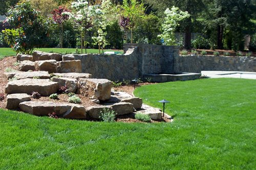 An underground drip system eliminates overspray with a curving lawn border. Aesthetic Gardens in Mountain View, CA