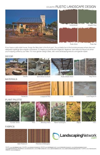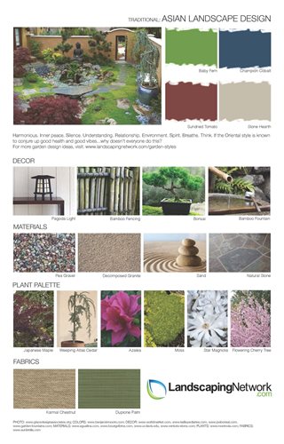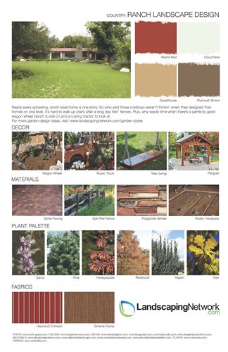 Get ideas for 21 landscape styles from these free, downloadable guidesUse these design sheets to get ideas for landscaping your property. Each sheet focuses on a particular landscape style and provides a color palette, décor suggestions, a list of materials, plant suggestions and outdoor fabrics. Choose your favorite garden style and take the design sheet to a professional landscaper to give them an idea of what you are looking for. They will be able to expand on what is shown and make sure that it is appropriate to your region and the architecture of your home.