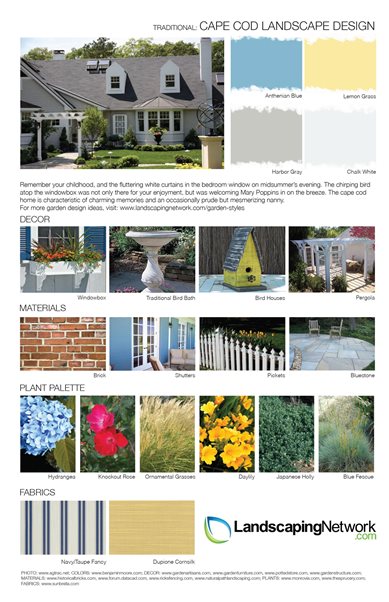 Homeowners can use this guide to easily compare materials, décor, plant palettes, color palettes, and fabrics from differing styles. While, landscapers can use it as a starting point to help determine their clients' tastes.