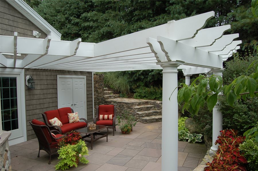 Reclaiming the front yard for additional outdoor living space is challenged by the exposure to the street, neighborhood and passing motorists. To create a patio that's appealing, it must feel like a space apart as defined by all three dimensions. First, the wide open nature of streetscapes requires the sky to be brought down to a human scale. Second is a need for enclosure to create a sense of intimacy for the users. This pergola attached to the front of the house extends living space into the open air, not as a shade giving structure, but one that defines space while contributing privacy.