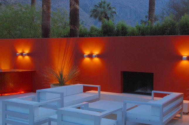 Solving a problem and creating an amenity at the same time is the essence of good design. The need to screen pool equipment at the far end of this pool offered the opportunity to stop the eye with an ever changing plane that functions like a movie screen. The base color is in itself is appealing , but using the lighter color makes the perfect background for shadow effects created by day, and lighting by night. This technique can be applied to a variety of other walls in different style landscapes. Exploit the plain vertical surface to background exotic potted plants, art, treillage or even a fountain. Pool equipment problem solved becomes the birth of new ideas.