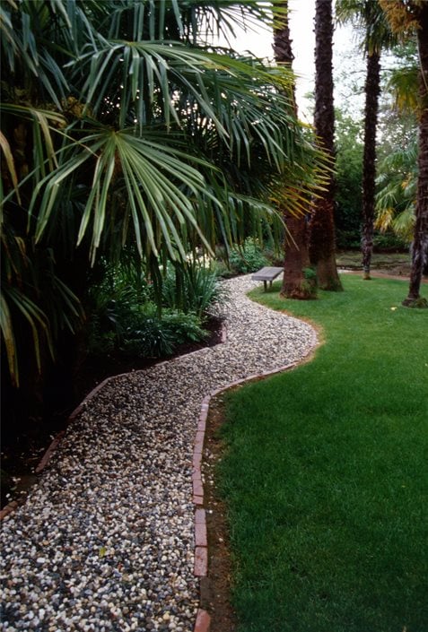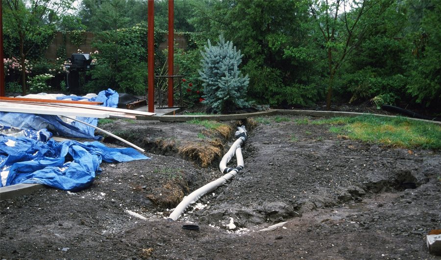 Homesites with clay soils suffer problems with lingering surface water. In theory every lot was graded to drain so that water in the backyard flows through a swale down the sideyard to the curb or storm drain. The reality is that builders don't always get their grades right and water becomes trapped, causing muddy zones in lawns and planting areas (see Lawn Drainage). When your designer creates the new drainage plan, it may utilize surface grading to ensure there is enough fall to drain. If there is not, another option must be found.