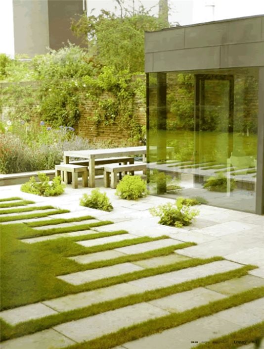 While the wall brings loads of history to Kidston's garden, the paving adds contemporary style. Rectangular pavers in a light grey were used to create a smooth, clean patio. I especially like how Kidston blurred the typically distinct division between paving and greenery. Small sections within the patio were left unpaved and used as planters. And to add even more modern flair, strips of pavers in differing lengths jut out from the patio and into the lawn.
