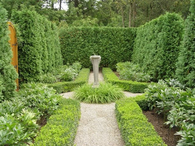 French LandscapingIf you’ve ever visited France, you know they have some of the most splendid gardens in the world. This example, inspired by French landscapes, employs geometry and symmetry. Tall hedges acting as walls surround the garden and add privacy, while at the center of the space is a sundial that sits atop a carved stone column. The walkways are paved with pea gravel which crunches slightly underfoot.