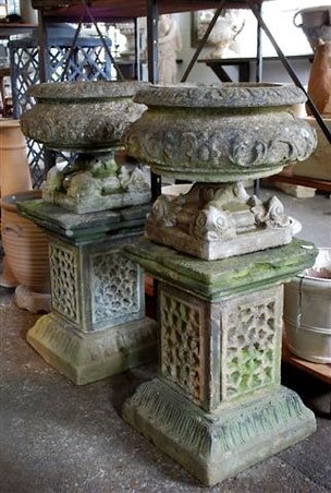 Ornate Urns Urns sitting atop a pedestal make for an ideal focal point in a garden. A matching pair can flank and mark the entrance to a walkway or garden room. Here, ornate English urns sit on vermiculated plinths from Detroit Garden Works
