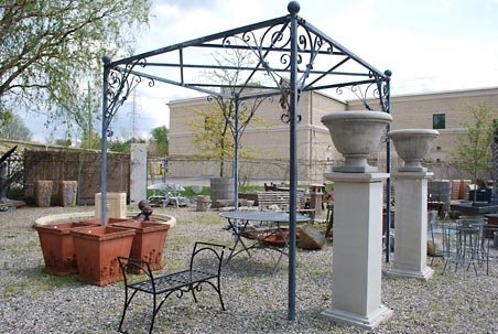 Cast Iron Gazebos Antique cast iron gazebos make a statement in any garden, as do pergolas built of reclaimed lumber. Here is an acid washed steel pergola with graceful scrolled brackets and orb finials from Detroit Garden Works