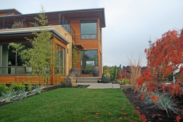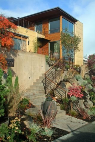 "The owners wanted a cohesive, attractive, functioning entry space that was worthy of their new home," says landscape designer Lisa Port, APLD, of Banyon Tree Design Studio, Seattle. The upper roof terrace offers commanding views south to downtown Seattle, as well as the surrounding neighborhood. The plants on the front slope were designed to have maximum curb appeal in the fall season. They include Cotinus 'Royal Purple' (smokebush), Panicum 'Heavy Metal' (blue switch grass), blue oat grass, yarrow, Agapanthus, Oakleaf hydrangea, and Anemanthele (New Zealand wind grass).