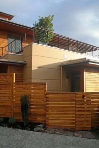 The entry stairs feature two landings built around a 10-foot-tall integrally colored concrete retaining wall. The railing, which mimics the architect-designed roof deck railing, is painted metal with handrail caps made of ipe lumber (a Brazilian hardwood). A paper bark maple (Acer grisum) was planted at the top of the second landing.