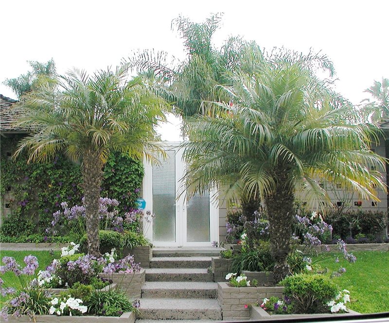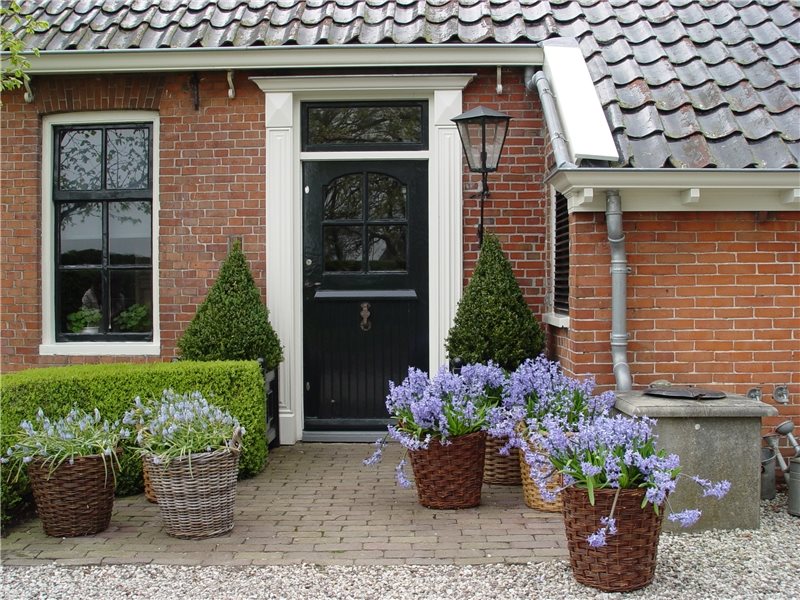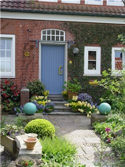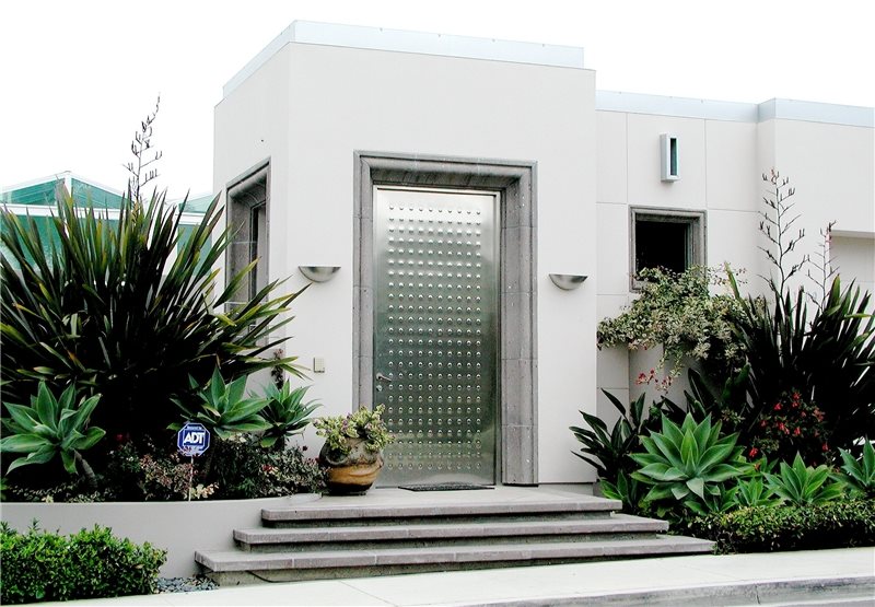 If there are steps up to this entry level, make them as wide or wider than the entry walk to avoid a bottleneck. Wider steps offer opportunities for beautiful pots to flank the entry. Planting at the stoop is another way to upgrade an entry. Spring flowering or fall color accent trees are the most affordable way to emphasize this location. Adding detailed close up planting gives waiting guests something beautiful to peruse. Ambient lighting or attractive light fixtures can further highlight the entry location after dark.