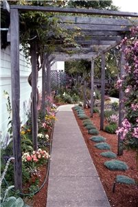 If steps are involved, consider stretching the tread while maintaining riser height. This roomy tread more gradually takes up the grade. If the walkway curves, wider treads accentuate its beauty.