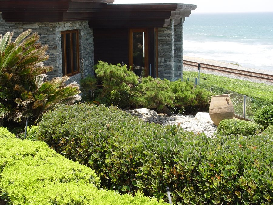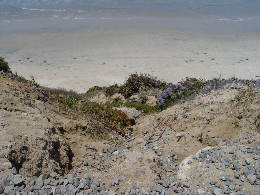 Freeway slope planting is the most widespread example of how a single monoculture of spreading plants such as iceplant or African daisy was used to protect the surface. Although it solved the problems of scouring and slowed velocity, there was nothing to prevent sloughing.