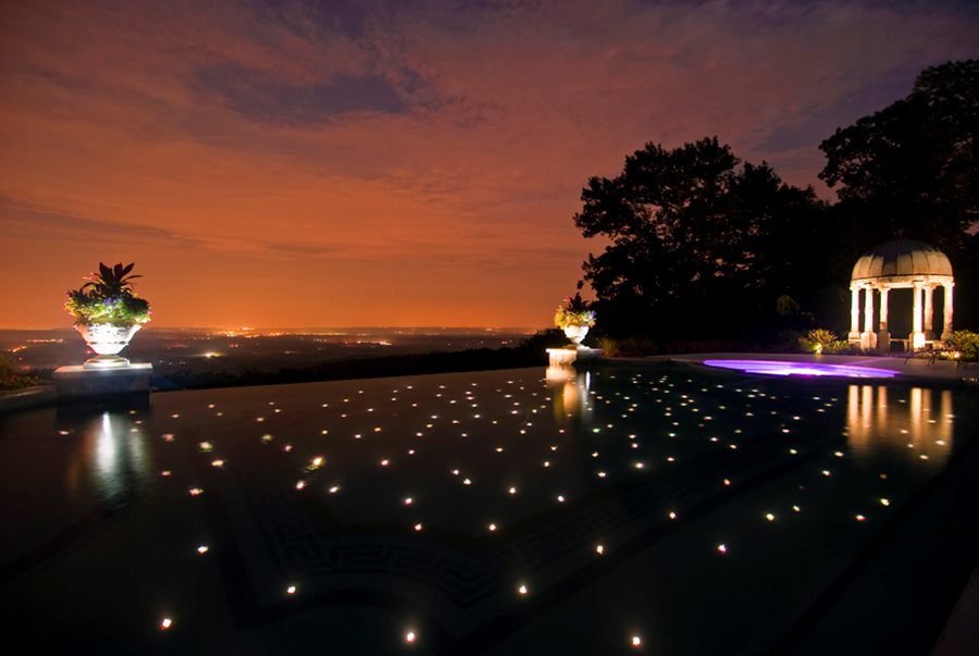 Cipriano Landscape of New Jersey are masters of unique luxury pool lighting effects. In this pool fiber optic fixtures are worked into the pool bottom to create a starlight effect that allows pool water to meet the night sky's stars seamlessly.