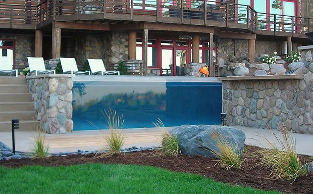 The newest feature of custom pools and is a thick clear acrylic wall shown here in a project by Apex Landscaping of Grand Rapids, Michigan. This example shows how this effect is most often seen on multilevel projects.