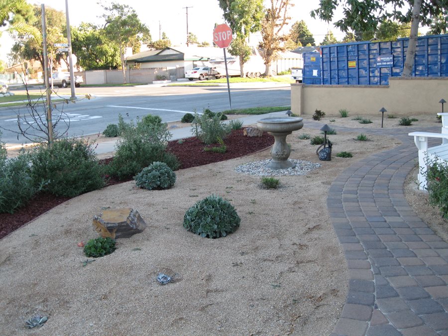 encourages winter rainfall to flow to a low point in the landscape where carefully-chosen plants can use it.