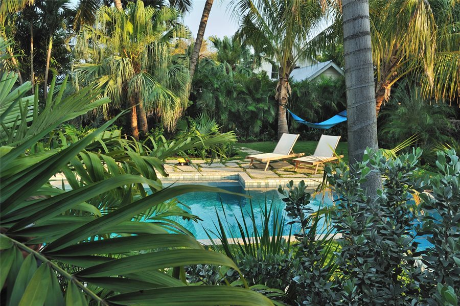 Another concern Reynolds had was ensuring that the plants near the pool would not shed leaves or other debris into the water. "Nearly 30 palms were brought into the rear garden," he states, "they are good near the pool because of their relative cleanliness." On the back side of the pool a bed of Ficus Green Island was planted for its dark green foliage and resistance to shedding leaves. Other plants used near the pool include Lantana and Thatch Palms.
