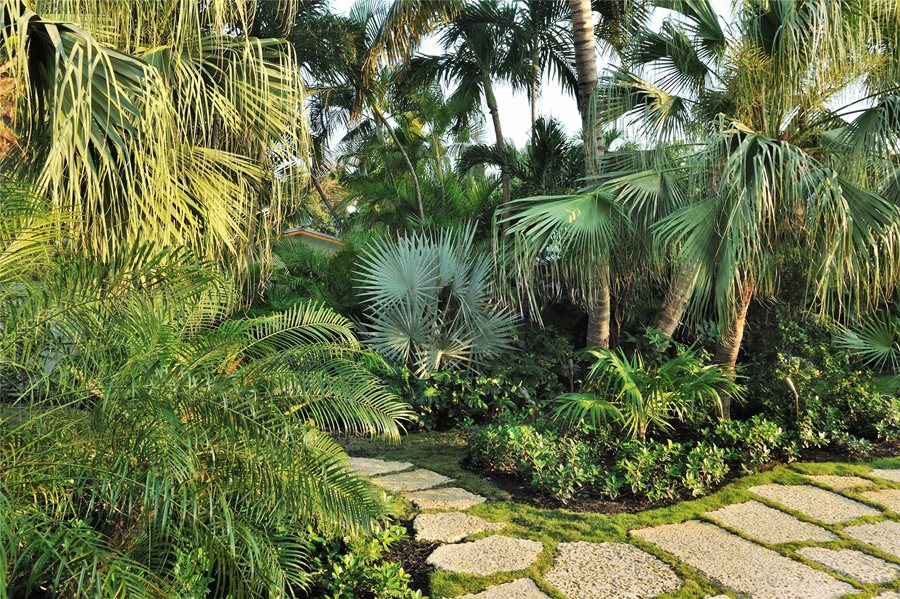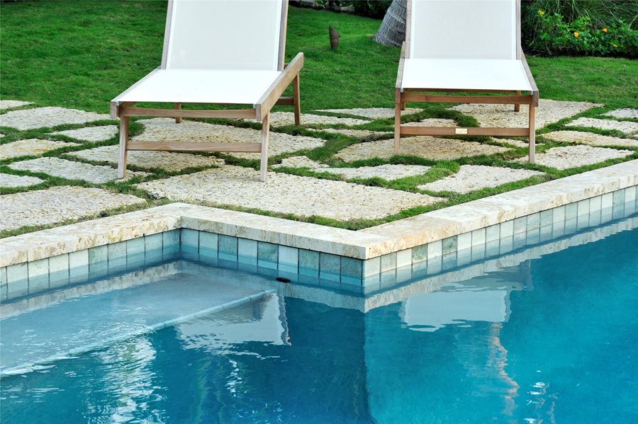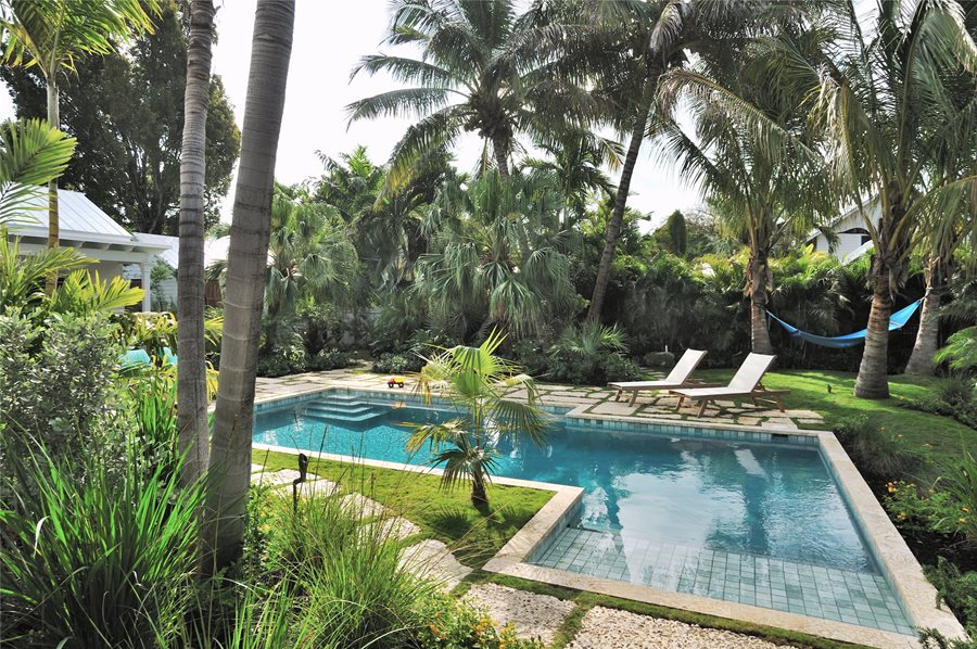 The pool is the focal point of this tropical garden. While simple in design, it features high quality materials that give it a luxurious appearance. The interior of the pool is finished with French Grey Diamond-Brite, a plaster containing natural quartz, that helps to create the vivid water color that is characteristic of the tropics. Along the waterline, 4" x 4" Ming-Green marble tiles add a refined touch of color and pattern. The coping surrounding the perimeter of the pool is Cut Coral Stone from the Caribbean that measures 2" x 8" x 16". The color variations make it appear textural, but it has been smoothed so that bathers won't scrape their skin or snag their suits. Finally, the paving that makes up the pool deck is large slabs of Miami Oolite stone. "I selected Oolite for its size, texture and local identity," says Reynolds. Each stone measures approximately 4" thick x 24" x 36" - larger stones means fewer joints, which is what Reynolds wanted.