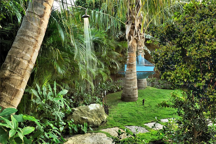The owners use the pool for all sorts of activities. Their five year old son can often be seen splashing in the water or pushing a toy dump truck around its deck. While the father, a member of a polar bear club, uses the pool's chiller to set the water to 65 degrees. The mother enjoys relaxing with a good book on a lounge partially submerged on the shallow shelf near the master bedroom. Accompanying the pool is an outdoor shower that the family can use to rinse off before or after a swim. The copper pipe and rain head were attached to the trunk of an existing Coconut Palm. Reynolds describes it as a simple, farmhouse-style element.