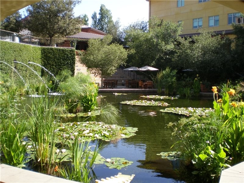 This koi pond is designed well. It holds plenty of water, has fountains for aeration, and has lots of plants that provide the fish with food, shade and places for hiding. Photo used under Creative Commons from flickr user s_w_ellis.