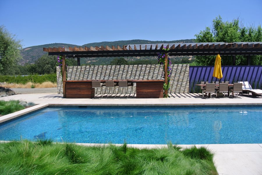 Shade structures are highly variable and their design will relate to the style of the house as well as the overall palette of the yard. This can be attached to the house itself or freestanding within the landscape. Shade may be filtered light through a vine shrouded arbor or sheltered under a solid roof structure over an outdoor kitchen or gazebo. In very hot climates such as the desert Southwest or Florida, the need for a protective shady space adjacent to the pool is essential.