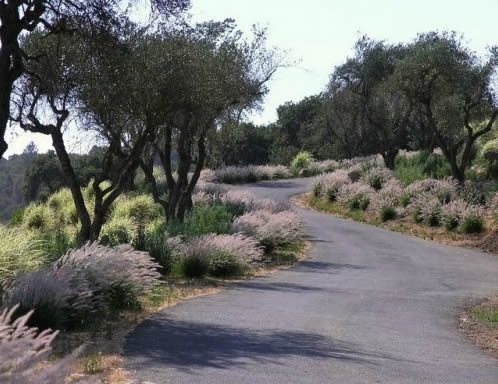 Gentle curves help this driveway blend in amongst the ornamental grasses and olive trees. Michelle Derviss Landscape Design in Novato, CA.