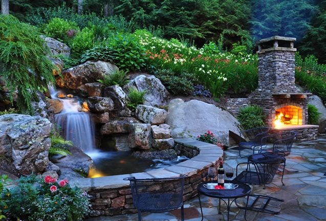 Pond lighting is a fun way of enjoying the ripples and reflections of your pond or water feature, even at night. You can keep it simple and classic by using white lights hidden among the rocks, or put colored filters on the lights to add a splash of color to your water feature. Waterfalls make a particularly good focal point. “We use underwater lights near the falls,” says Edward Snyder of Greenleaf Services, Inc. in Linville NC. “This creates a focal point that can be enjoyed from the patio or from indoors,” he says.
