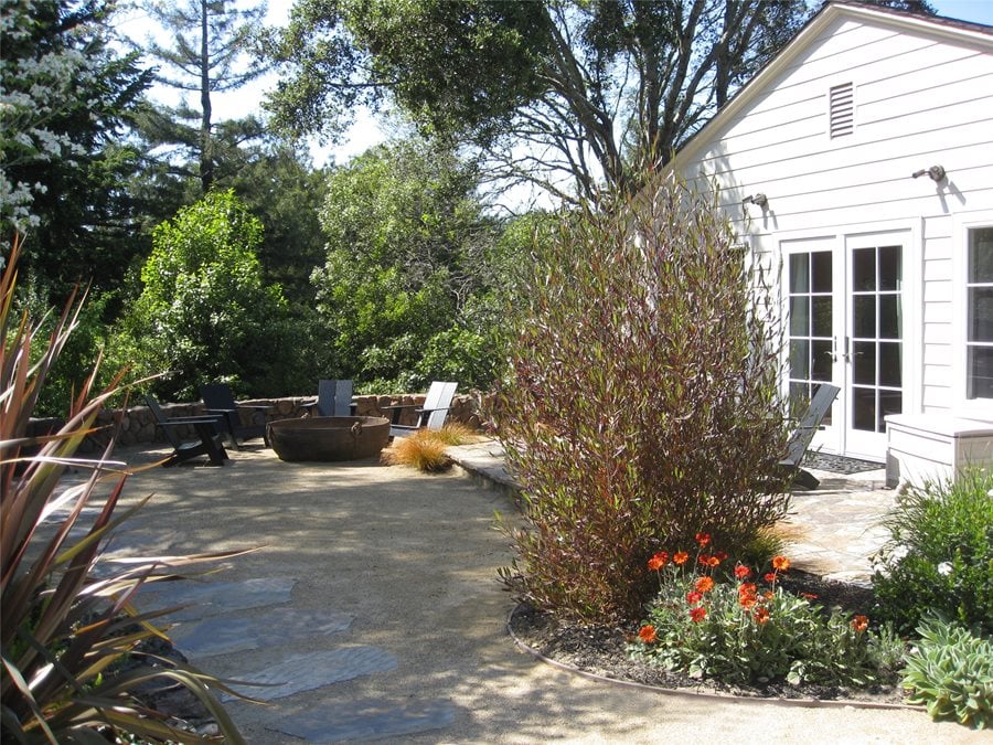 This outdoor space was once a patchy lawn that required a lot of maintenance. The homeowners decided that they would be happier with a low-maintenance backyard that still suits the needs of their children and dogs. So the solution was to get rid of the grass and replace it with decomposed granite, flagstone paths, and low-maintenance, drought-resistant plants. They also added a fire pit made from a retrofitted rustic cauldron.