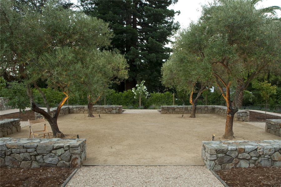 When it comes to maintenance, this backyard design requires very little effort. Anchored by low stone walls and four olive trees, this decomposed granite patio offers extra space to set up tables when hosting a party or can be used for a game of bocce ball. Many people would have planted a lawn in this space, but this option requires much less maintenance and still looks great. After heavy use the decomposed granite may need a little raking to smooth it back out and every few years it will need replenishing as some of the rock works its way into the soil.