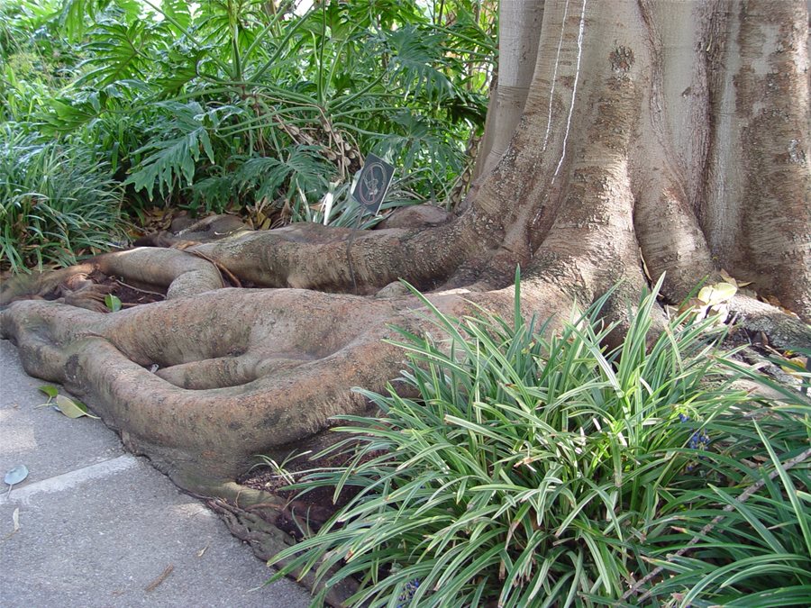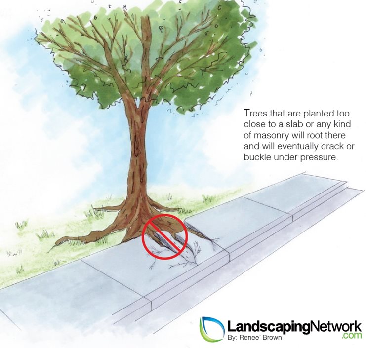 Anywhere you have paving, foundations, curbs and other forms of masonry, consider how close the trees are to these elements. Masonry tends to trap moisture in the soils beneath a concrete slab, for instance. Trees located near that slab will try to root there to access the cool damp conditions in the heat of summer. Year after year they continue tapping into this resource, and like vines, grow larger in diameter. The result is inevitably pressure upon the masonry, no matter what kind it is, and soon it will crack or buckle under the pressure.