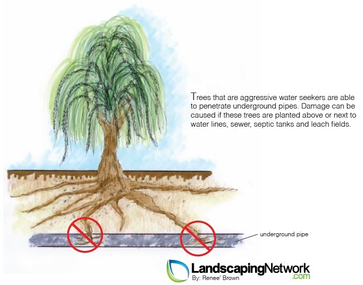 When the toilet won't flush and the kitchen drain clogs up, chances are you have roots in the sewer line. This problem can arise from trees and shrubs planted on or next to water lines, sewer, septic tanks and leach fields. While all trees are water seekers, there are two groups that are the biggest offenders: water lovers such as willow and drought tolerant species such as locust. Willows and their kin produce a vast network of fine roots designed to hold banks of rivers, and these are the most able to penetrate the tiny gaps in underground pipes. Drought tolerant species evolved large and aggressive root systems able to travel a great distance and to surprising depths to reach water in their arid homelands. Both groups are excellent water sensors and always root directly toward any regular source.